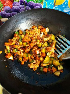放入鸡丁、胡罗卜丁、黄瓜丁,翻炒收汁,加少许盐,即可出锅。