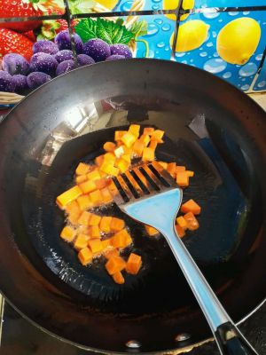 热锅热油,放入胡罗卜丁炒至断生,盛出沥油备用。