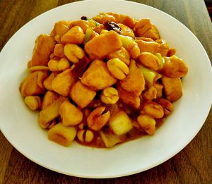 锅中放油加入花椒爆香,然后加入豆瓣酱炒出红油,加入鸡丁进行翻炒,然后加入葱段,最后加入料汁,进行翻炒,收汁,加入花生 ,最后加几滴香油即可出锅。