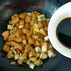 待锅内水分收干,鸡肉变色先将鸡肉捞出。