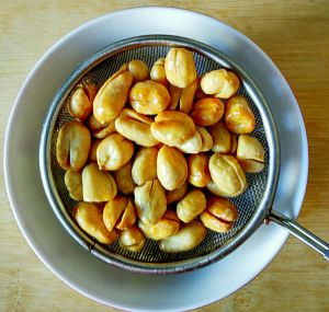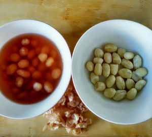 将花生清洗后,用开水浸泡10分钟后去皮,凉干水份备用。