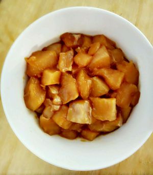 每次做菜都在赶时间没照每个步骤。 将鸡肉切十字花刀后再切丁。 鸡丁用半勺醋半勺生抽盐适量入味抓匀。