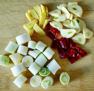 大葱切丁。姜蒜切成薄片,干辣椒切成1.5厘米的节。