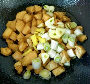 然后,把肉块,放在油锅里炒,然后捞出肉块儿。