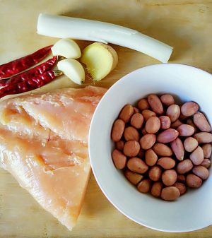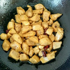 锅内加入油,炸花生,然后捞出。加入少量油,大火,放入鸡丁,到鸡丁发白成块。