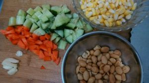 鸡胸肉切丁用料酒和盐腌制十分钟,期间把花生米炸脆备用,准备好玉米粒,黄瓜丁,胡萝卜丁。