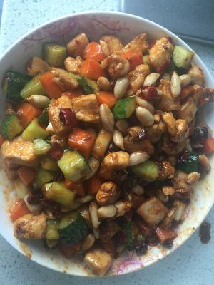 热油炒鸡肉丁,肉变白加玉米粒,胡萝卜丁,黄瓜丁,翻炒几圈加酱油,白砂糖适量,盐少许,味精,翻炒均匀,出锅前倒入花生米,翻匀,搞定啦