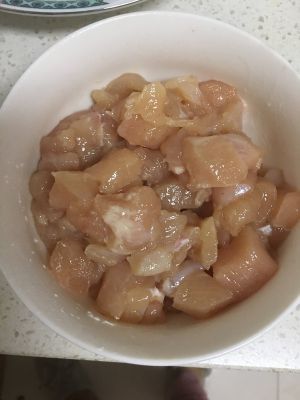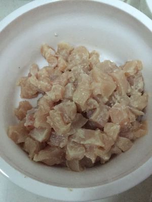 2. 鸡丁切粒,加芡粉,拌匀