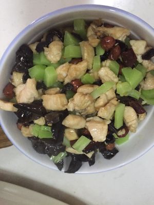 4. 倒油,加干海椒段,倒木耳,倒鸡丁。鸡丁七成熟,加莴笋。起锅。