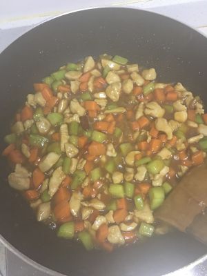 炒好胡萝卜黄瓜丁倒入鸡胸肉炒一会,最后把勾芡好的汁倒入锅中。备注:勾芡的汁做法,加入水,生粉,酱油,白糖,醋即可