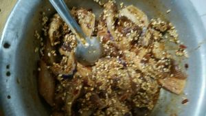 腌制猪肉。在肉上加甜醋,料酒,酱油,蚝油,姜末,糖。腌制半小时后就可以把肉裹上米粉啦