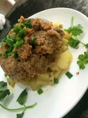 土豆铺在盘底,撒上蒸肉粉。肉片裹上蒸肉粉码在土豆上