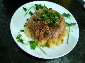 用适当大小的盆子来装肉和土豆。先将肉依次整齐的由盆地一直摆叠上来。不要留有空隙。接着再把土豆也摆上去