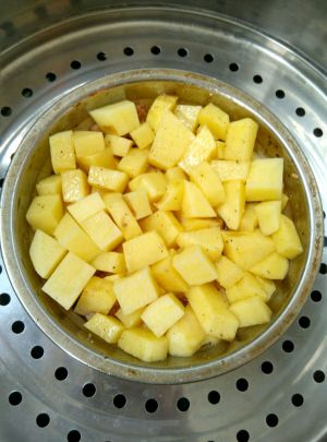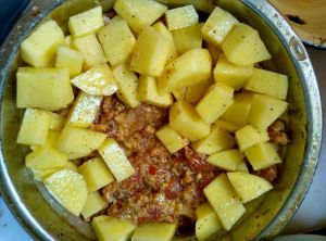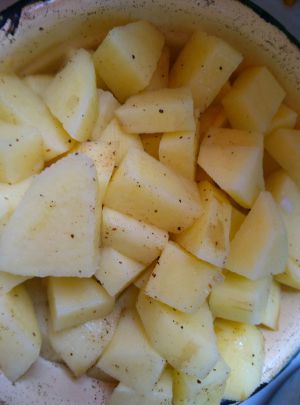 用腌制肉的时间将土豆去皮切成块状,加入盐和五香粉抓均匀