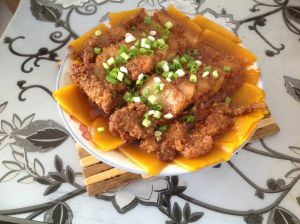 蒸熟后便可以起锅。用选用的盘子放在上面,再倒扣,拿掉铁盆。撒上葱花