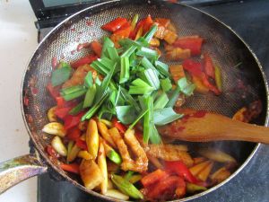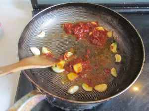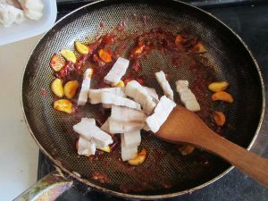 加入红辣椒和大蒜白,将它们翻炒几下;