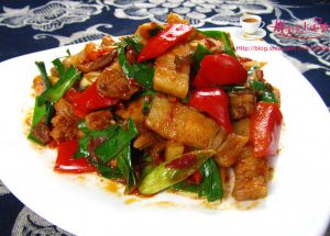 锅烧热,倒油,把肉片倒入锅中炒出香味,加入2勺郫县豆瓣酱炒香。