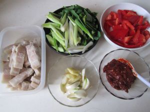 翻炒两下后加入切片的五花肉一起翻炒, 直至五花肉表面都裹着豆瓣酱且微微出油后;