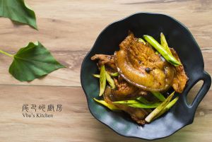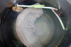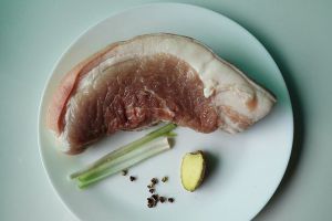 猪肉刮洗干净,放入沸水中,加入葱段、花椒、拍破的姜块,使水保持微沸状态,煮30分钟。