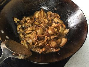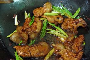 放红酱油,加入蒜苗翻炒均匀出锅。