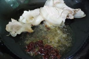 将肉片拨至一旁,锅中间放豆瓣炒出香味。