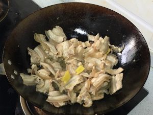 大火冷锅放油,油温五成热时下肉片炒至开始卷曲。