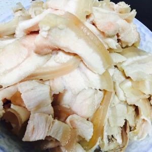 取出煮熟的猪肉泡冷水至凉。