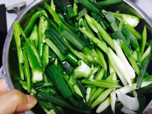 青椒切斜段,蒜苗杆切斜段,叶子切成长条,备用