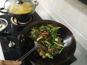 认为合适了就加入青椒和蒜苗杆,炒几下再放蒜苗叶,超不多快好了起锅前放些味精就可以了