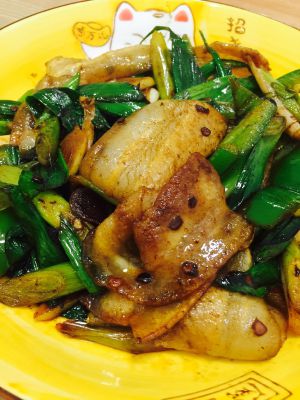爆炒切片的五花肉,再加入姜片、蒜、豆瓣酱、糖、生抽、蒜苗、辣椒,装盘。