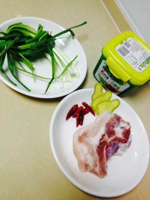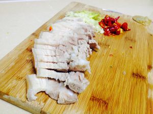 晾凉的五花肉切成3毫米的薄片 (我切厚了),另外姜切丝,干辣椒切圈,青蒜切段
