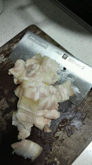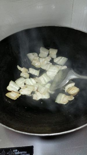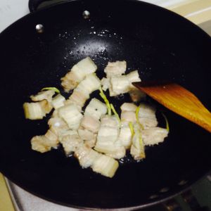 五花肉切薄片,下油锅翻炒,不要炒太久