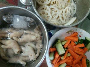 凤爪洗净剪去指甲(我买的是肉鸡爪爪),冲洗干净焯水,再用清水煮10分钟。捞出用凉白开水冲2遍。
