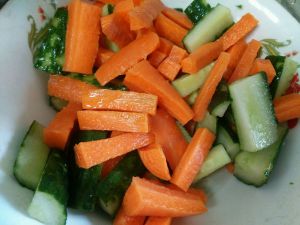 黄瓜胡萝卜切成条,舀少许 (一大勺或2小勺)盐淹渍半小时, 淹渍出来的水倒掉,黄瓜胡萝卜条,待用。