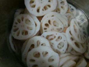 莲藕切成片,入沸水过焯一下捞出, 放冰水里放凉,待用。
