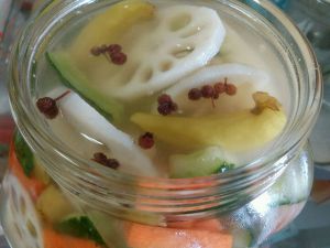 待用的食材装瓶,加少许白糖,醋, 拌匀食材与汁水。
