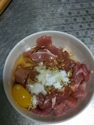 加入〖料酒,味极鲜,糖,胡椒粉,淀粉,一个鸡蛋清,盐〗,抓匀,腌制一会儿