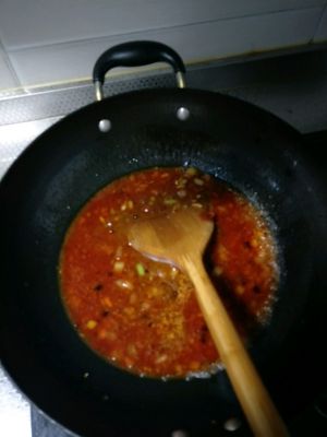 再起锅加油,放入事先准备好的葱姜蒜,干辣椒段,然后加入豆瓣酱,炒啊炒啊,多炒一会