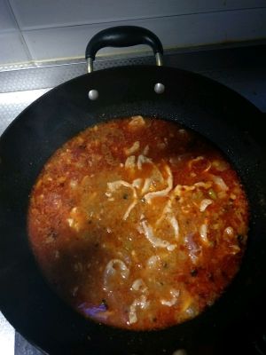 洋葱炝锅,炒入郫县豆瓣酱,然后加足量的盐和水和耗油,放了一些火锅底料,主要是放底料里面那个牛油,吃火锅剩下的那么半袋牛肉片,有点点少。