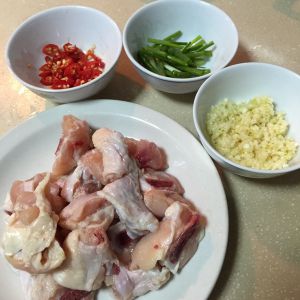鸡腿切丁,姜蒜切末,葱切葱花,花生米炒熟(可直接买熟油炸花生米),海椒对半切开