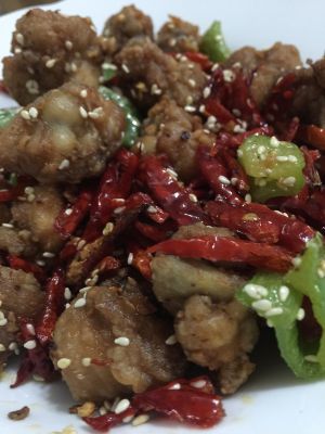 在热油,至7成热时,倒入姜蒜炒出香味后倒入干辣椒和花椒,翻炒至气味开始呛鼻,油变黄后倒入炸好的鸡块,炒至鸡块均匀地分布在辣椒中后撒入葱段,味精,白糖,熟芝麻,炒匀后起锅即可。