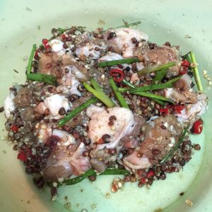用盐、生抽、鲜辣椒、花椒、蒜泥、葱、黑胡椒粉腌制鸡肉一小时以上