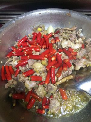 加入鸡块翻炒,然后放盐,老抽,料酒炒几下,加入尖椒翻炒,加盖焖2分钟