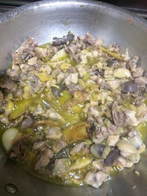 将鸡腿肉与鸡骨头分离,鸡腿肉切做小块备用,鸡油、鸡皮部分切小备用,这个工作很费时