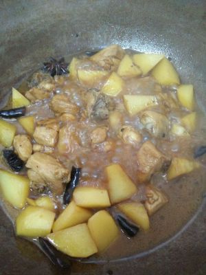 锅内倒稍微多一点的油,干辣椒掰成两瓣和八角放入,炸下,然后放入鸡块,炒至金黄,依次放生抽,老抽,盐,鸡精,半碗水,土豆,汤快收干的时候放入少量白糖或冰糖,翻炒出锅