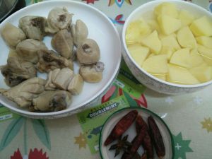 买的时候鸡腿让切成小块,土豆滚刀切块,鸡腿先用热水煮下,去除血腥,然后用凉水冲掉多余的血沫,辣椒八角备用
