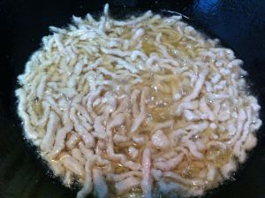 另起油锅,倒入猪里脊肉,炒熟,倒入漏勺中。