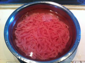 里脊肉顺着切成丝放入水盆里泡一下