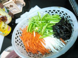 2.肉丝放着淀粉,小半勺盐腌一下,趁这空挡把切丝的蔬菜,放滚开的开水烫下