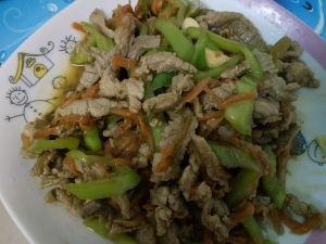 将买来的食材洗好,将肉切成条,放进一个小盆里,加上一点生抽搅拌至全部被肉吸收。放在一旁待用。(一定完成这个步骤再去切胡萝卜和尖椒(⊙o⊙)哦,这样也节省时间)当然喜欢加料酒的可以加一点点进去
